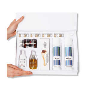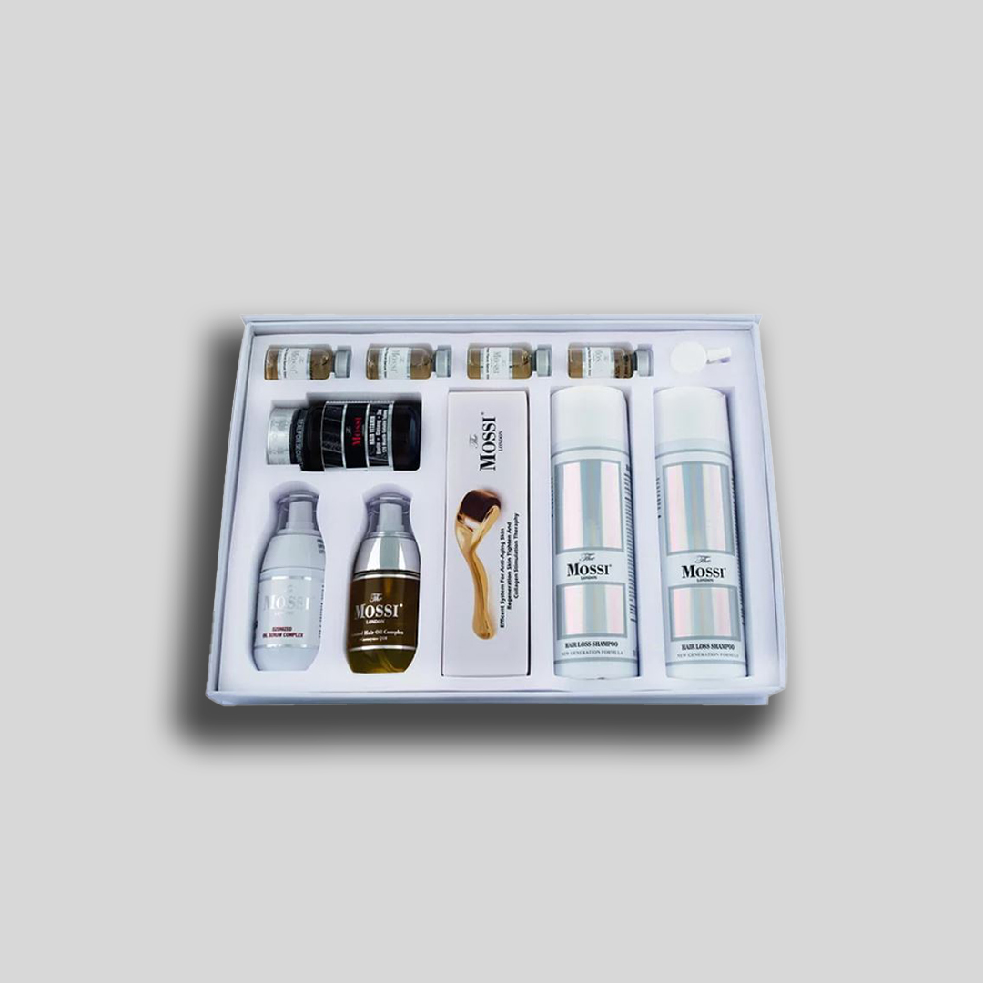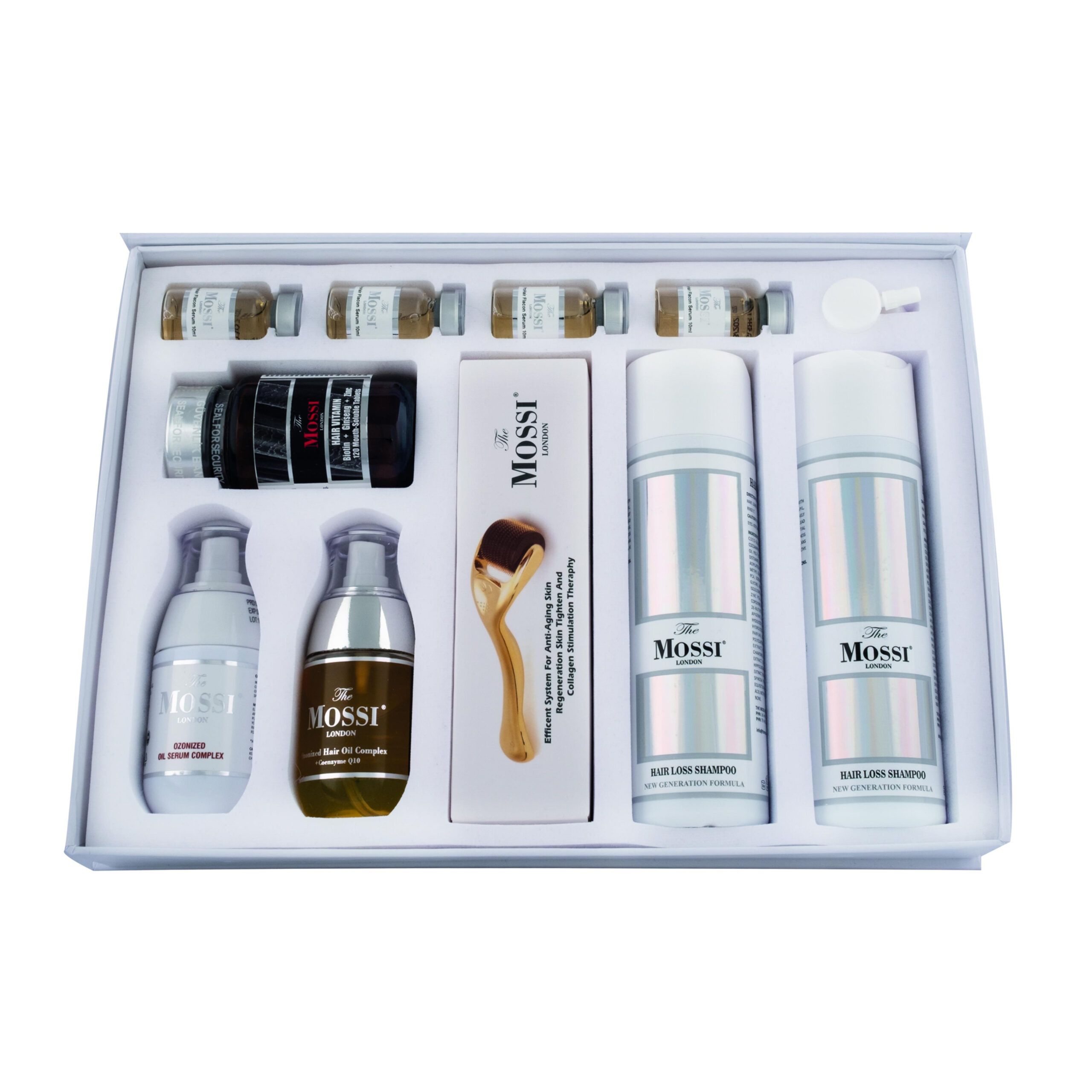 The Mossi London 2 Months set includes 2 Shampoo, 2 Serum, 1 Vitamin, 4 flacons, and 1 derma-roller.
